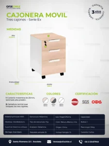 Fabricada en melamina de alta calidad con bordes de PVC de 2 mm, incorpora tres cajones de distintas alturas: dos cajones superiores bajos, ideales para artículos pequeños, accesorios y papelería, y un cajón inferior más alto, pensado para carpetas colgantes o elementos de mayor volumen. Todos los cajones cuentan con correderas metálicas, manillas embutidas y sistema de cerradura central para mayor seguridad.