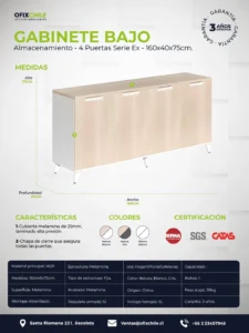 El Gabinete Bajo EX de 4 puertas está diseñado para ofrecer almacenamiento cerrado y accesible en oficinas operativas, estaciones ejecutivas o espacios administrativos. Su altura permite utilizarlo como superficie adicional de apoyo, manteniendo el entorno ordenado y profesional.