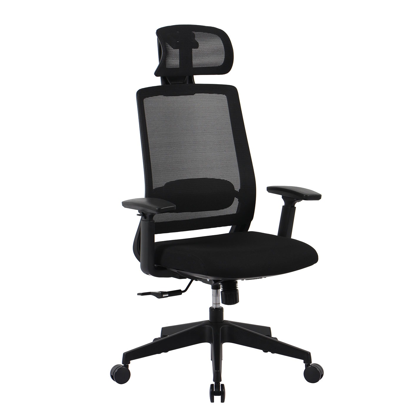 Silla Ades Negra: Modelo ergonómico con respaldo en malla, soporte lumbar fijo, cabecero, brazos 3D regulables y mecanismo reclinable. Ofrece confort prolongado y una postura saludable durante toda la jornada.