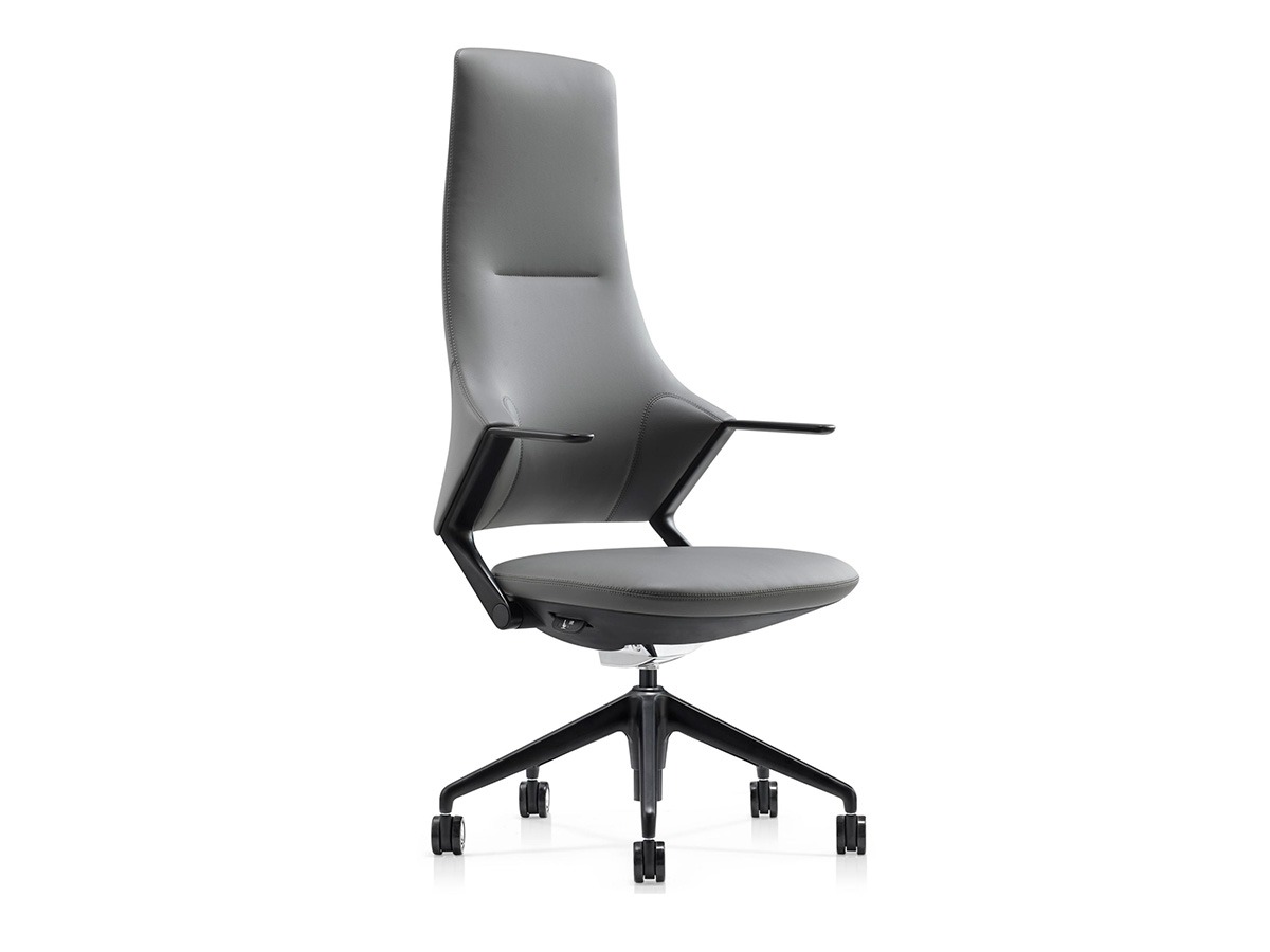 Silla de respaldo alto con diseño envolvente, curvatura lumbar integrada, asiento deslizante tapizado en ecocuero, mecanismo basculante con regulación de tensión, brazos fijos integrados y base cromada con ruedas silenciosas.