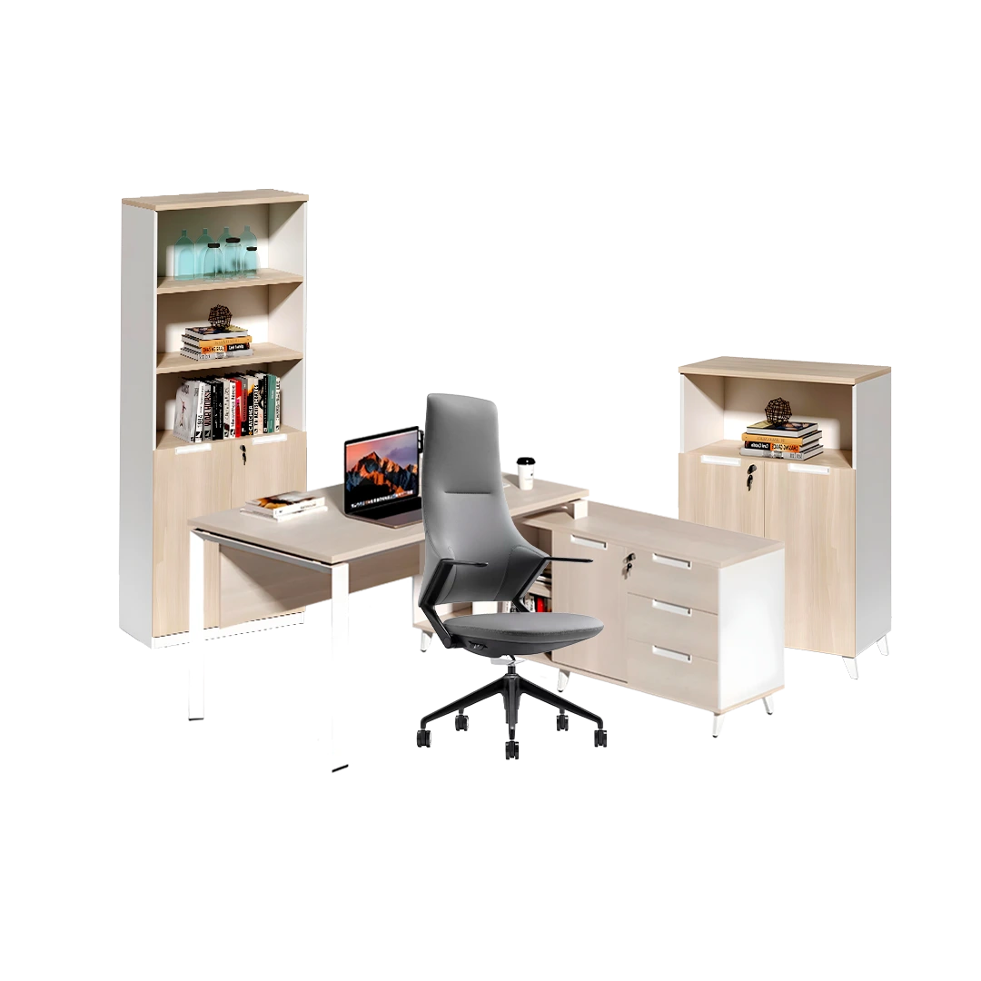 Estación ejecutiva con cubierta principal de 180×80 cm y retorno lateral de 160×40×65 cm con almacenamiento integrado: tres cajones, estantería abierta y módulo con puerta corredera. Cubierta de melamina anti rayas de 25 mm con borde de PVC y base metálica triangular de acero electropintado. Incluye faldón frontal y pasacables.