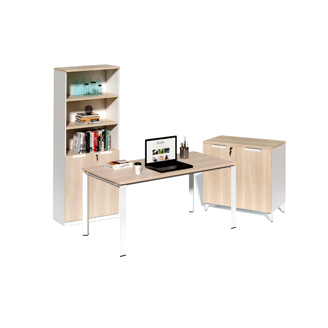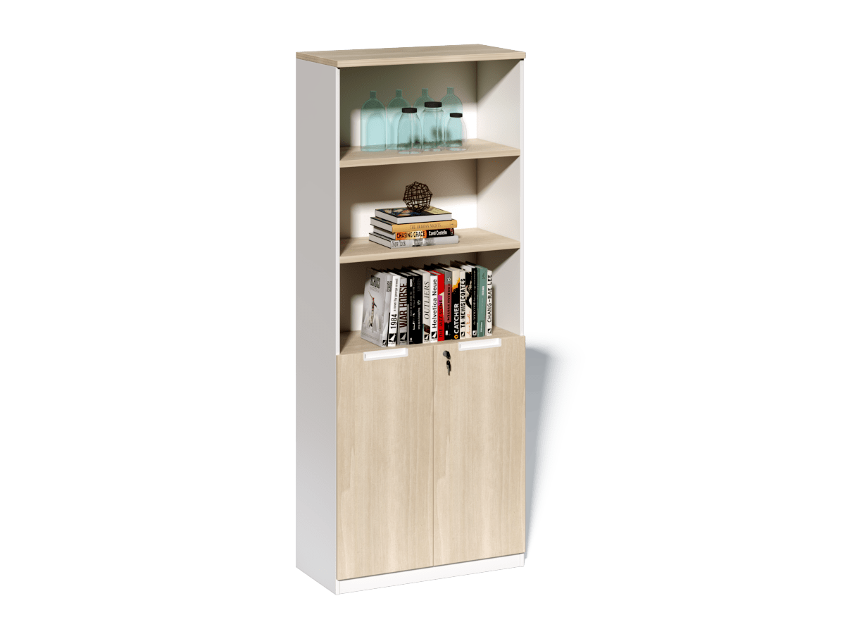 Biblioteca Abierta con Cerradura Inferior: con 3 estantes abiertos para organización visible y un módulo inferior cerrado con cerradura, ideal para mantener documentos y objetos personales protegidos.