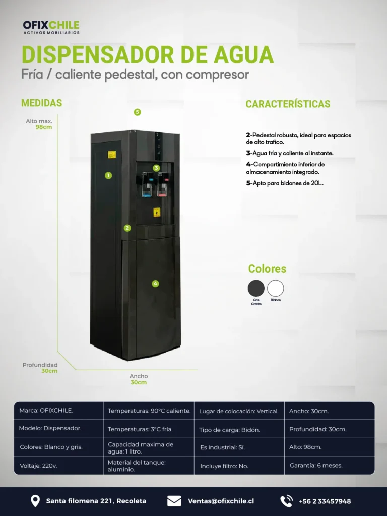 Cuenta con un diseño tipo pedestal robusto, ideal para bidones de 20 litros, y un compartimiento inferior perfecto para almacenar vasos, botellas o insumos de cocina y oficina.
