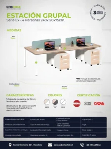 Importante: Las imágenes son referenciales. Muestran estación de 4 personas con separador, cajonera móvil y accesorios no incluidos en el valor del producto.