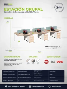 Importante: Las imágenes son referenciales. Muestran estación de 6 personas con separador, cajonera móvil y accesorios no incluidos en el valor del producto.