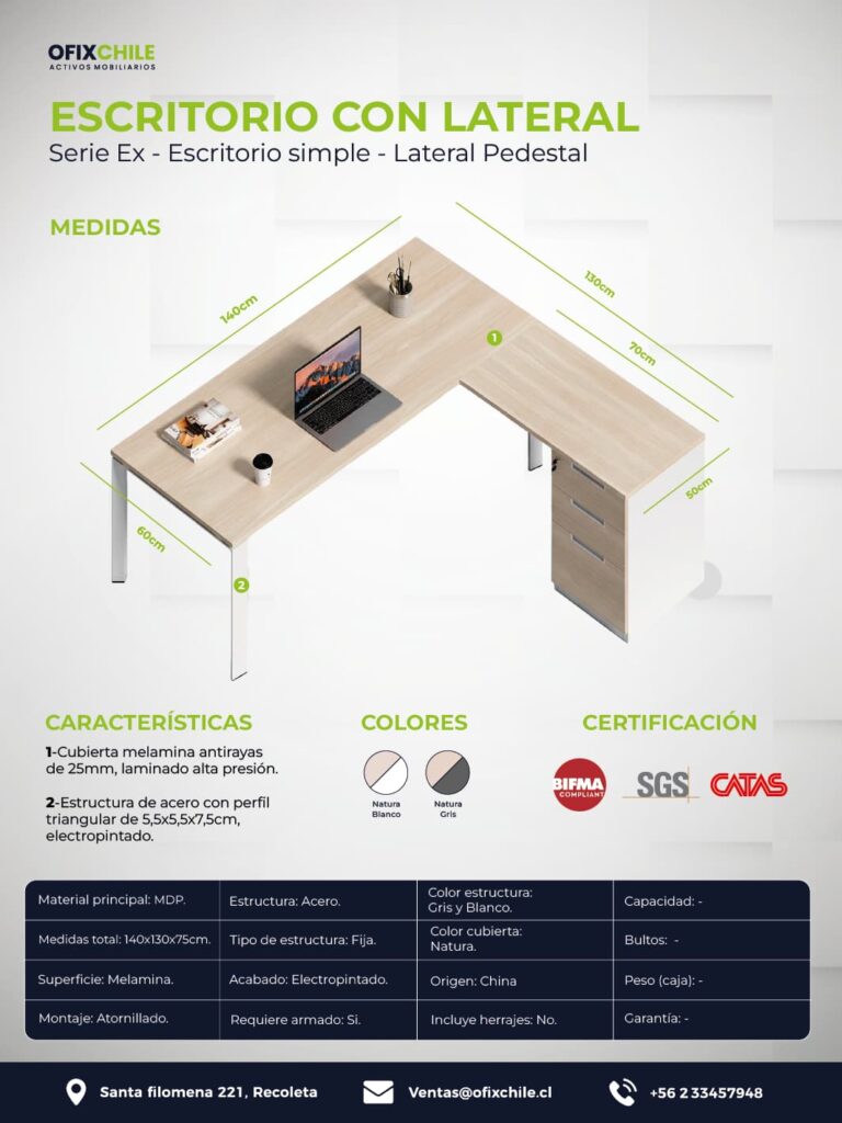 Escritorio ejecutivo de diseño moderno con retorno lateral de 50×70 cm, ideal para ampliar el espacio de trabajo. Fabricado con cubierta de melamina de 25 mm que entrega gran resistencia y durabilidad, combinado con patas metálicas de perfil 55×55 mm que aportan estabilidad y una estética contemporánea. Perfecto para oficinas que buscan funcionalidad, amplitud y estilo en un solo mobiliario.
