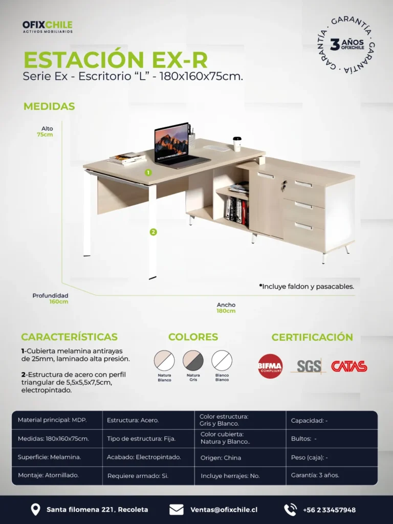 La Estación EX-R está diseñada para ofrecer una solución integral y robusta para espacios ejecutivos u operativos que requieren funcionalidad, diseño y almacenamiento integrado. Integra faldón frontal, pasacables en la cubierta y un retorno con módulo de almacenamiento incorporado: tres cajones, módulo con puerta corredera y estanterías abiertas. El mueble lateral mide 160 cm de largo por 40 cm de fondo y 65 cm de alto, complementando perfectamente la superficie principal de 180 x 80 cm.