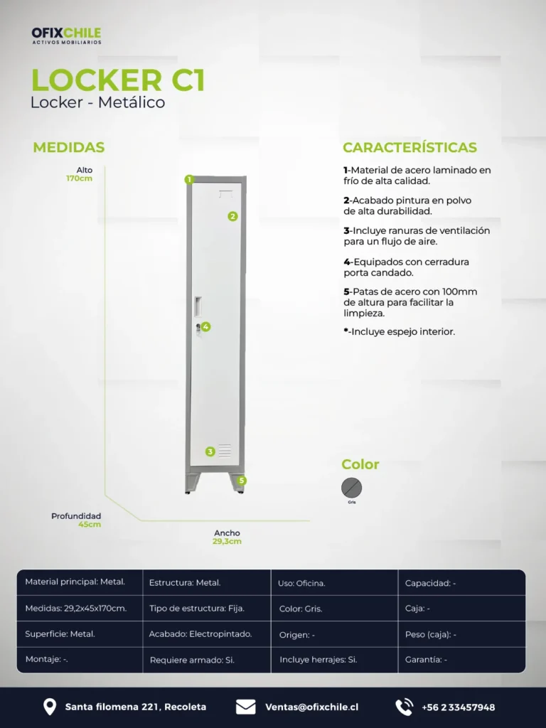 El locker metálico C1 está diseñado para brindar una solución de almacenamiento individual eficiente, ideal para espacios que requieren orden, seguridad y una estética profesional.