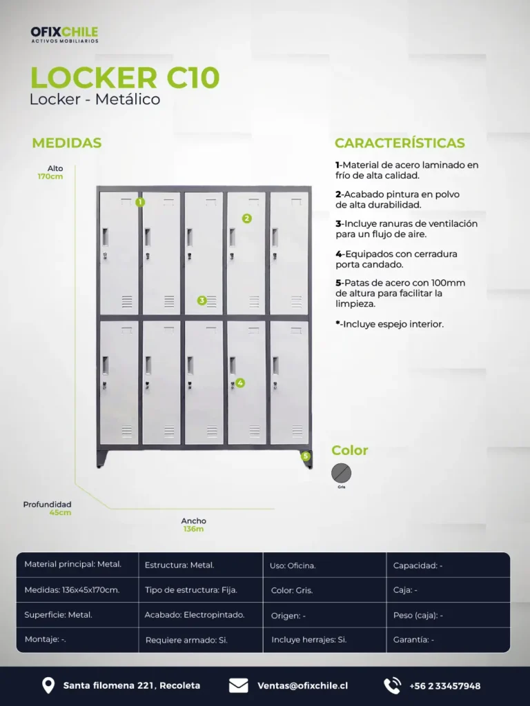 Cuenta con 10 compartimientos independientes, cada uno equipado con ventilación y sistema porta candado para mayor seguridad.