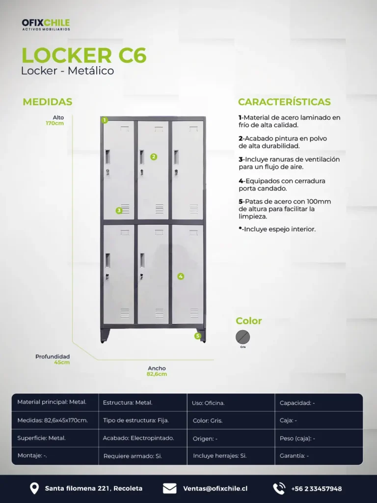 El locker metálico C6 combina capacidad y eficiencia en un formato compacto, ideal para espacios compartidos que requieren almacenamiento individual seguro.