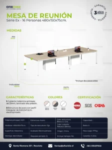 La Mesa de Reunión EX 480×150 cm está diseñada para grandes equipos que requieren un espacio de encuentro amplio, formal y altamente funcional. Ideal para salas de directorio, juntas corporativas o áreas de decisión estratégica.