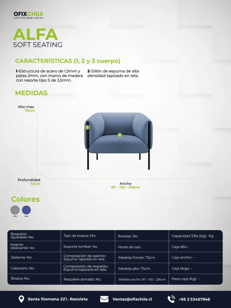 El Sillón Alfa ofrece una combinación ideal de comodidad, resistencia y diseño moderno. Cuenta con espuma de alta densidad y tapizado en tela suave, brindando un asiento cómodo para el uso diario.