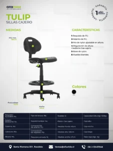 Tulip es una silla cajero diseñada para ofrecer soporte ergonómico básico, ligereza visual y resistencia prolongada en ambientes de atención o servicio técnico. Pensada para escritorios altos o mostradores, combina asiento tapizado con estructura metálica reforzada.
