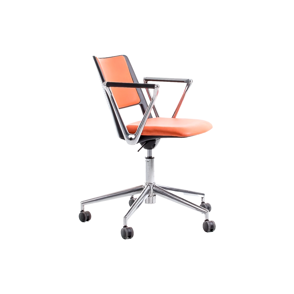 Equipa respaldo y asiento tapizados, base giratoria de nylon con ruedas y brazos fijos opcionales. Su estructura permite rotación de 360 grados, aportando mayor libertad de movimiento en estaciones de trabajo o atención al público.