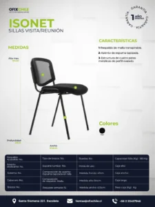 Isonet es una silla de visita diseñada para ofrecer resistencia estructural, ligereza visual y funcionalidad práctica en entornos corporativos o institucionales. Pensada para salas de espera, escritorios secundarios o zonas comunes, combina respaldo en malla con estructura metálica ligera.