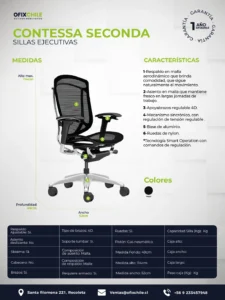Contessa Seconda Negra es una silla ejecutiva ergonómica de última generación, diseñada para ejecutivos y profesionales que exigen lo mejor en ergonomía, materiales y diseño. Pensada para estaciones de dirección de alto nivel, ofrece una experiencia de asiento premium con ajustes personalizados.
