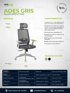 Ades Gris es una silla ejecutiva diseñada para ofrecer soporte ergonómico completo con una estética moderna y funcional. Pensada para oficinas que requieren confort prolongado y ajustes personalizados, combina estructura robusta y diseño profesional.