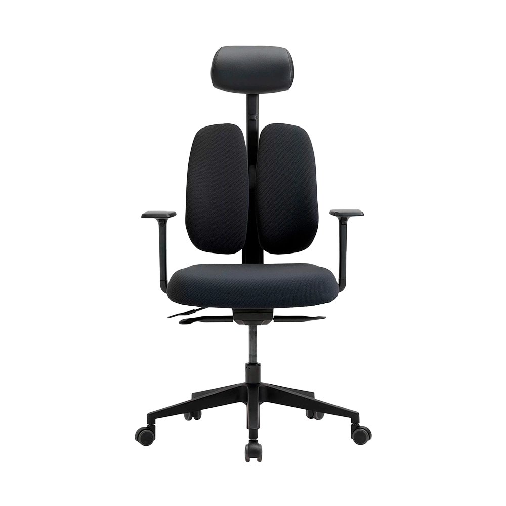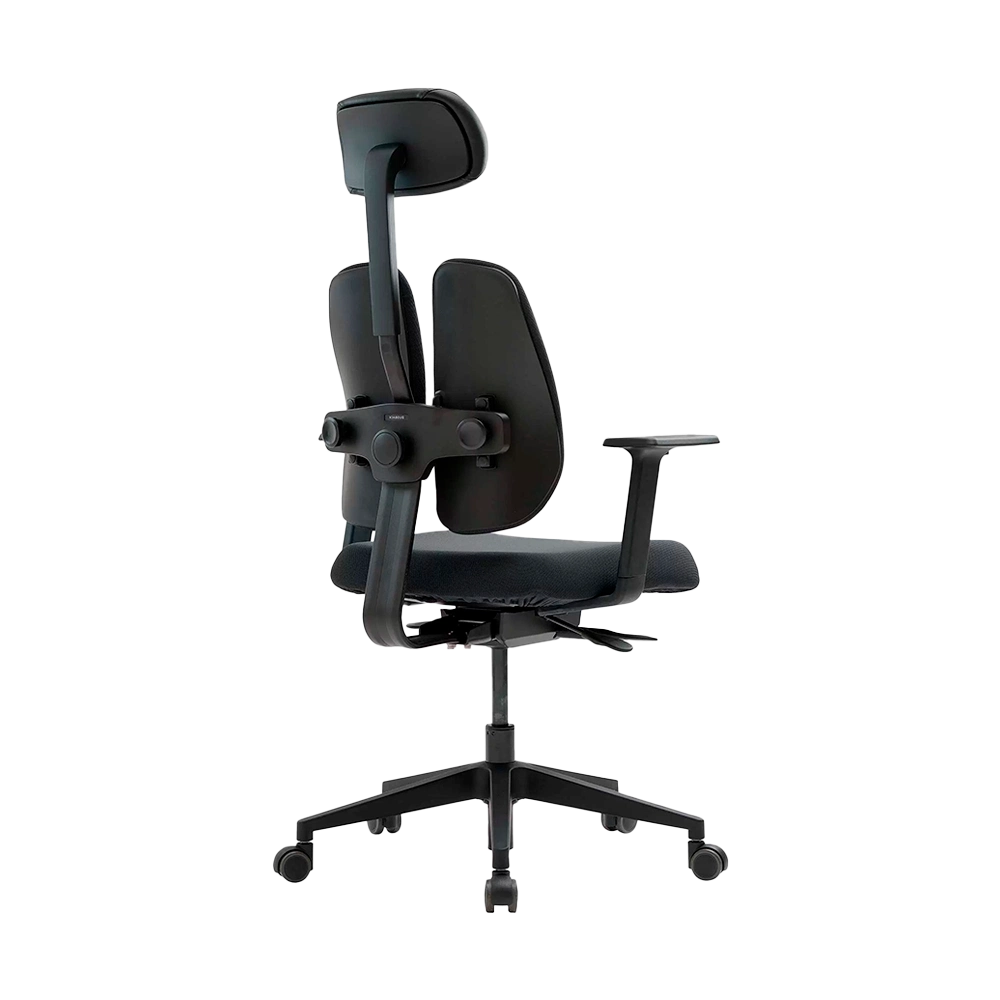 Cuenta con respaldo Duoback independiente, cabecera ajustable, asiento tapizado en espuma de alta densidad y brazos regulables en altura y ángulo. Incluye mecanismo sincrónico, base de aluminio y ruedas de alta resistencia para uso continuo.