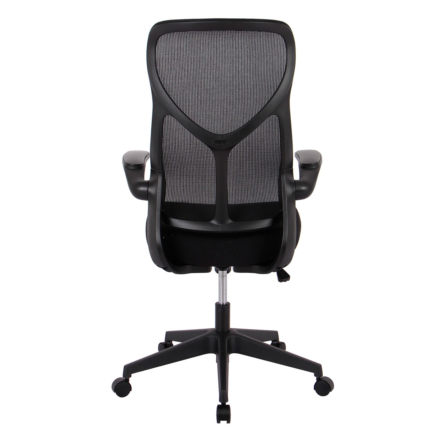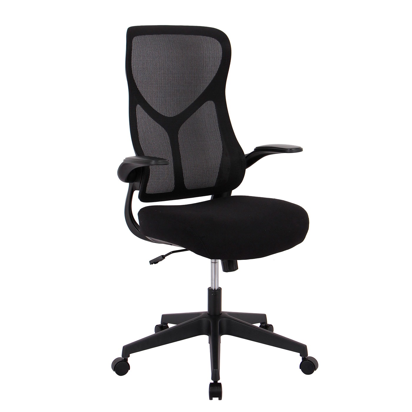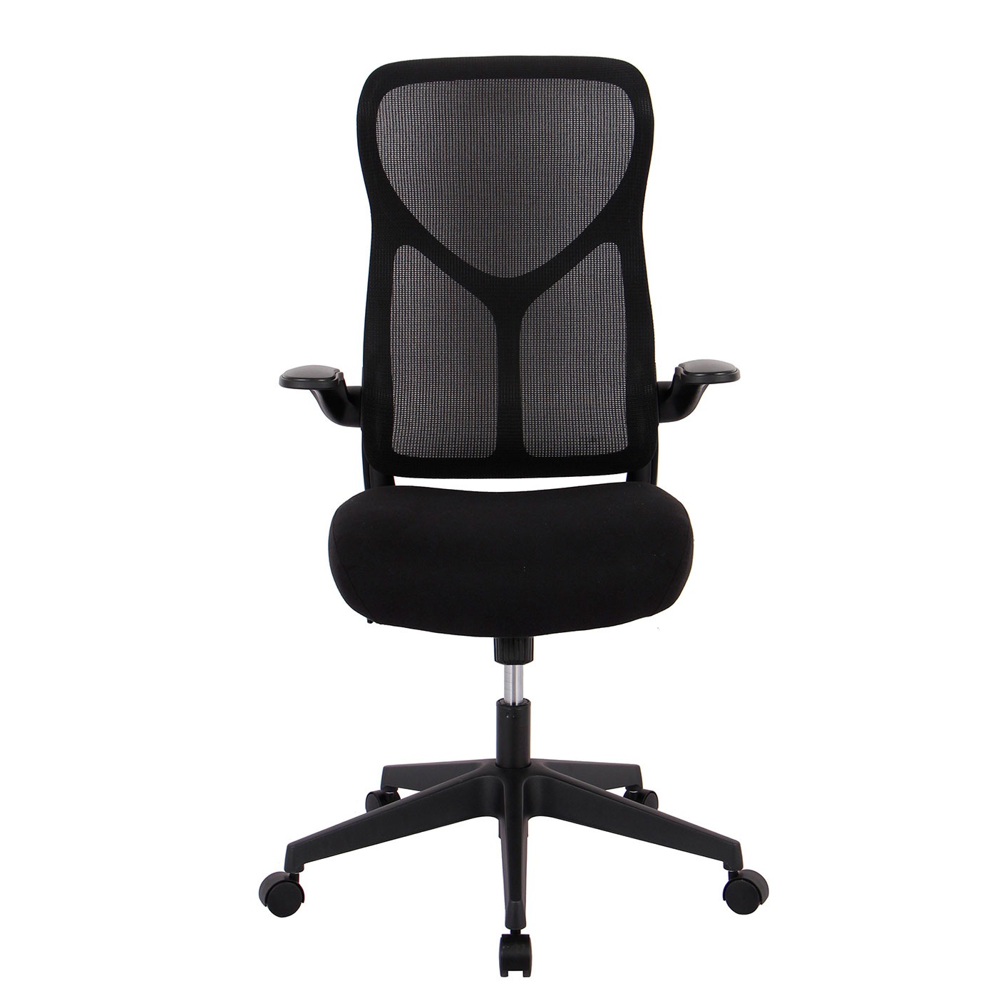 Cuenta con respaldo alto de malla para mejor ventilación, asiento tapizado en tela resistente y apoyabrazos abatibles que suman flexibilidad. Su mecanismo mariposa con un bloqueo, pistón de gas de 100 mm y base cónica de nylon de 340 mm aseguran ajuste, estabilidad y movilidad fluida con ruedas de nylon de 50 mm.