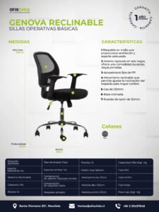 Génova Reclinable es una silla operativa pensada para ofrecer equilibrio entre confort, resistencia y estilo sobrio. Diseñada para entornos administrativos o de atención, su estructura combina ergonomía esencial con una presencia profesional y adaptable.