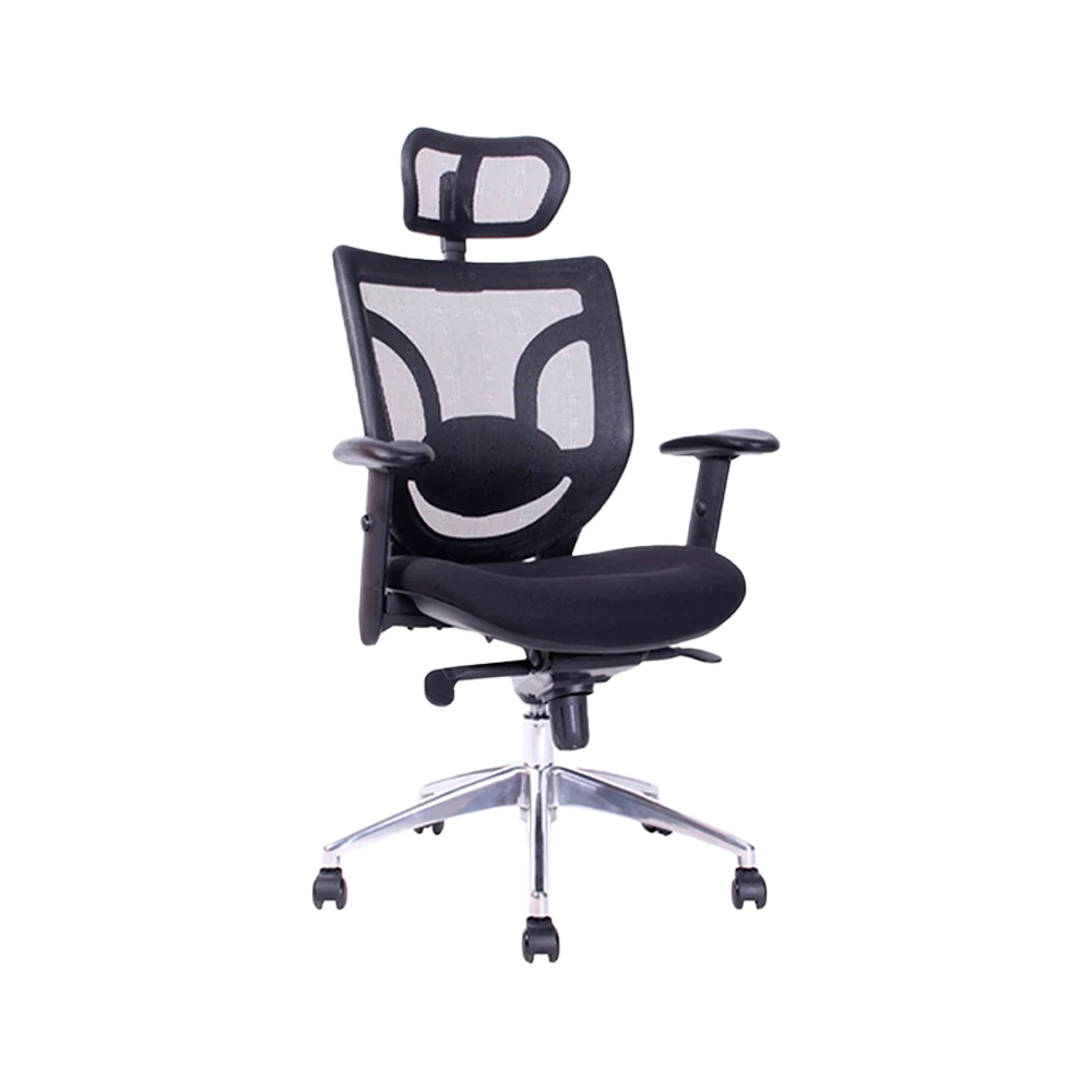 Cuenta con respaldo en malla negra reclinable que favorece la ventilación durante la jornada, e integra soporte lumbar fijo que aporta alineación postural. Su cabecero complementa el respaldo brindando soporte cervical adicional. El asiento está tapizado y acolchado para mayor comodidad. Los brazos son regulables en altura, lo que permite adaptarse a distintos usuarios y estilos de trabajo. La base giratoria con ruedas asegura movilidad fluida y ajuste de altura integrado.