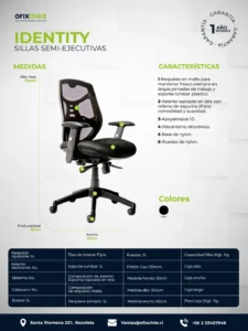 Identity es una silla semi ejecutiva diseñada para es una silla ejecutiva de diseño contemporáneo, pensada para oficinas que buscan un equilibrio entre confort prolongado y estética diferenciada. Su estructura ergonómica permite mantener una postura saludable durante jornadas largas, mientras que sus acabados transmiten profesionalismo.