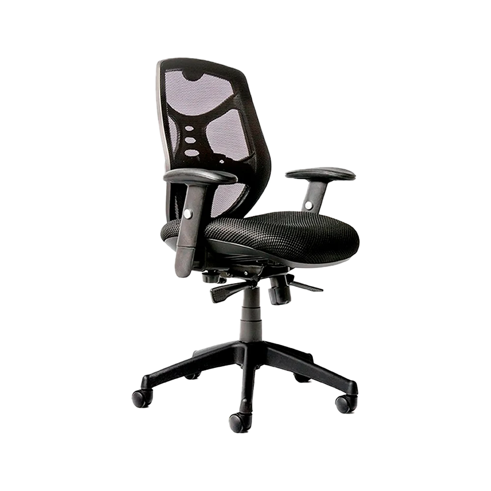 Equipada con respaldo alto en malla técnica, asiento tapizado y mecanismo sincrónico, ofrece soporte lumbar ajustable y brazos regulables para adaptarse a diferentes usuarios. Su base de aluminio pulido refuerza la sensación de calidad y estabilidad.