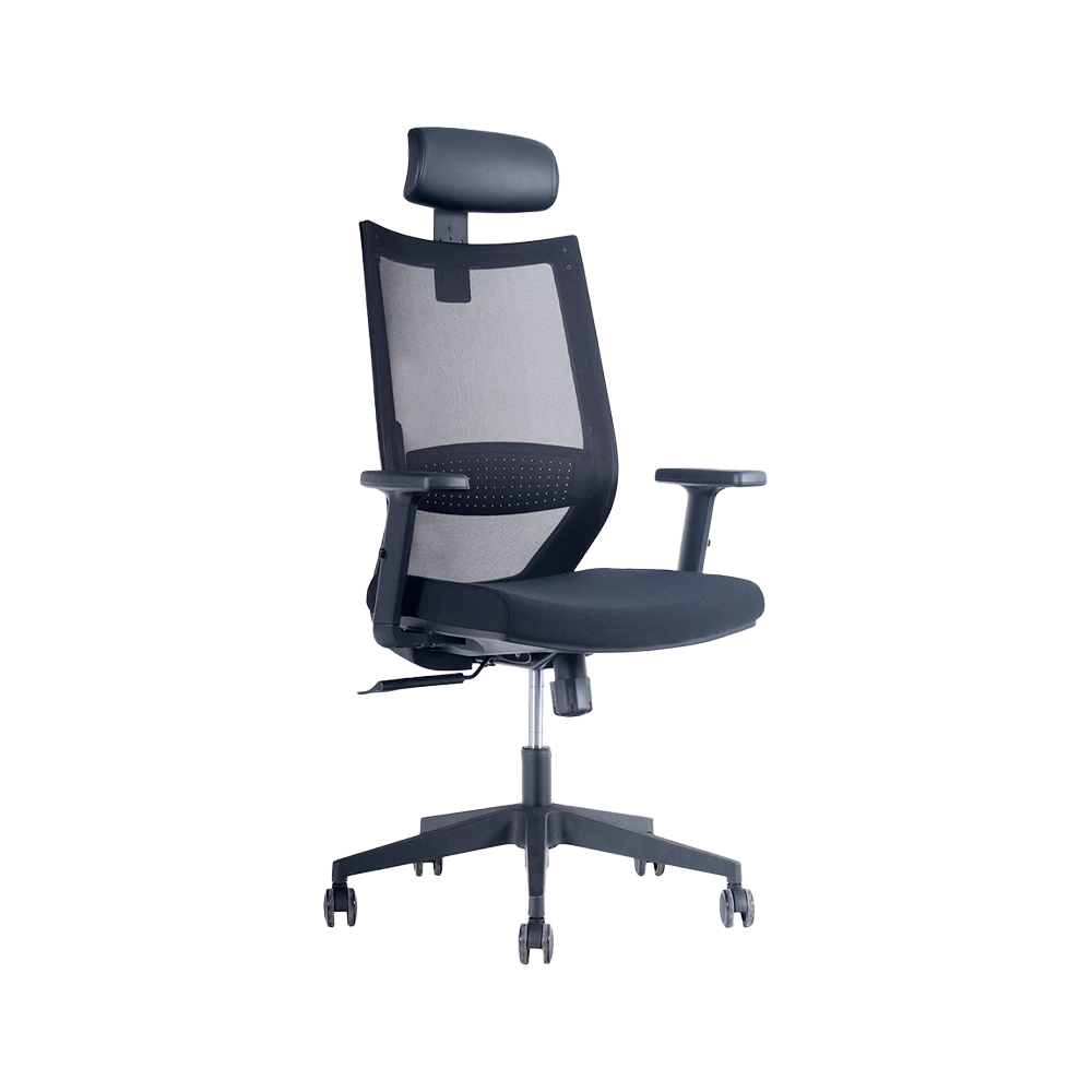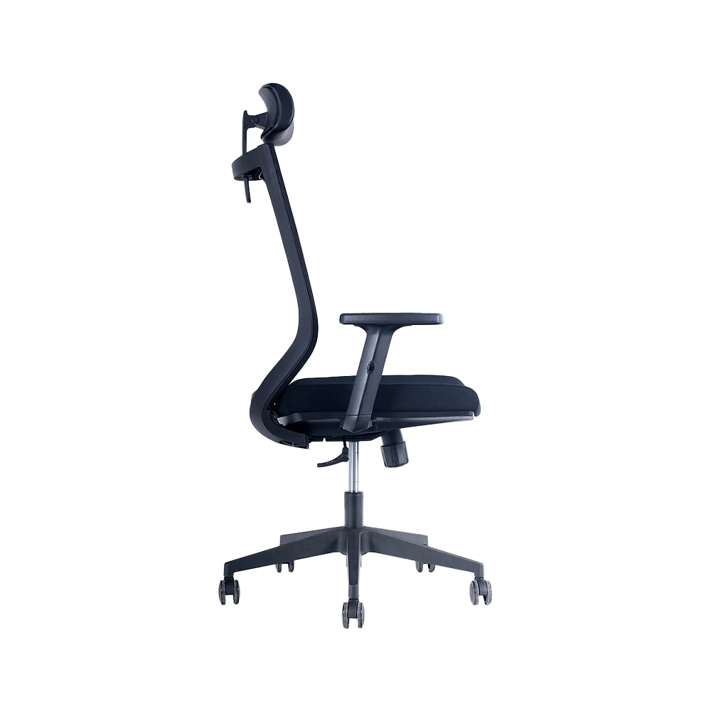 Equipada con respaldo medio en malla reclinable, incorpora un soporte lumbar fijo que favorece una postura más alineada. El asiento está tapizado y acolchado para ofrecer comodidad prolongada. El cabecero integrado brinda soporte adicional en la zona cervical, ideal para pausas o tareas prolongadas frente al escritorio. Cuenta con mecanismo de inclinación con bloqueo y ajuste de altura. Los brazos son regulables en altura, lo que permite adaptarse a diferentes contextos de trabajo.