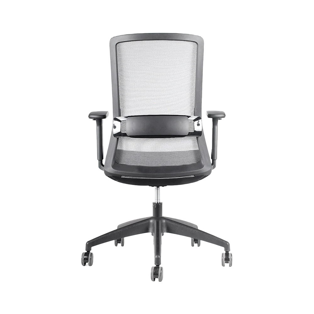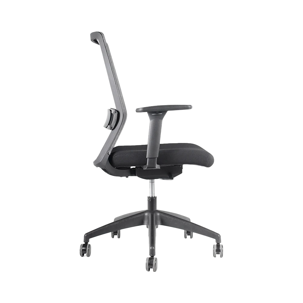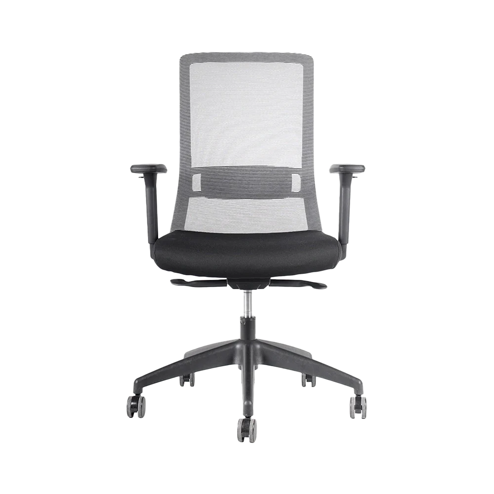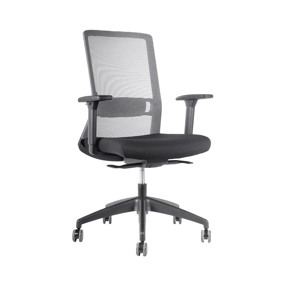 Cuenta con respaldo medio en malla, asiento tapizado y base giratoria con ruedas de nylon, permitiendo una experiencia cómoda durante jornadas prolongadas. Incluye ajuste de altura y brazos regulables que aseguran una postura estable.