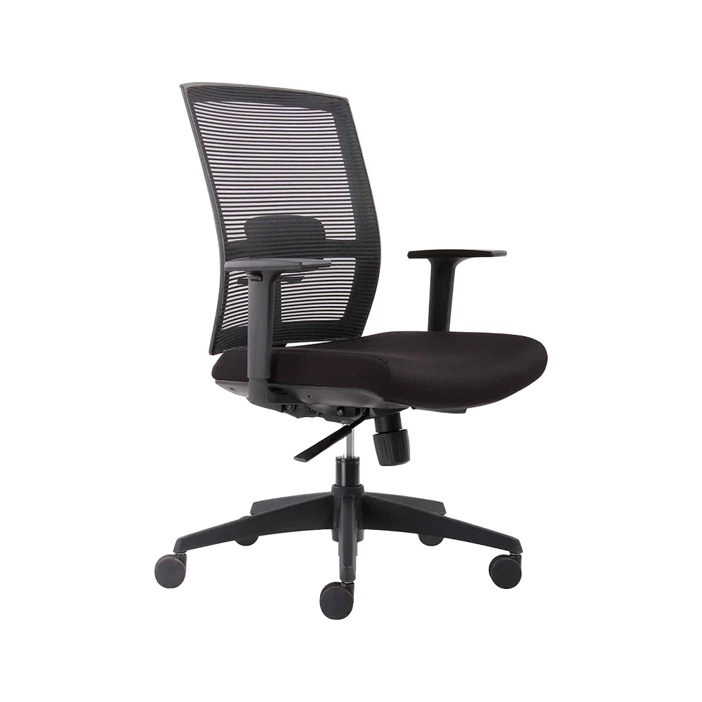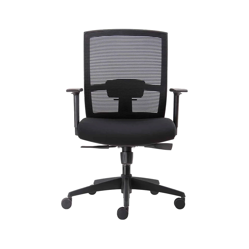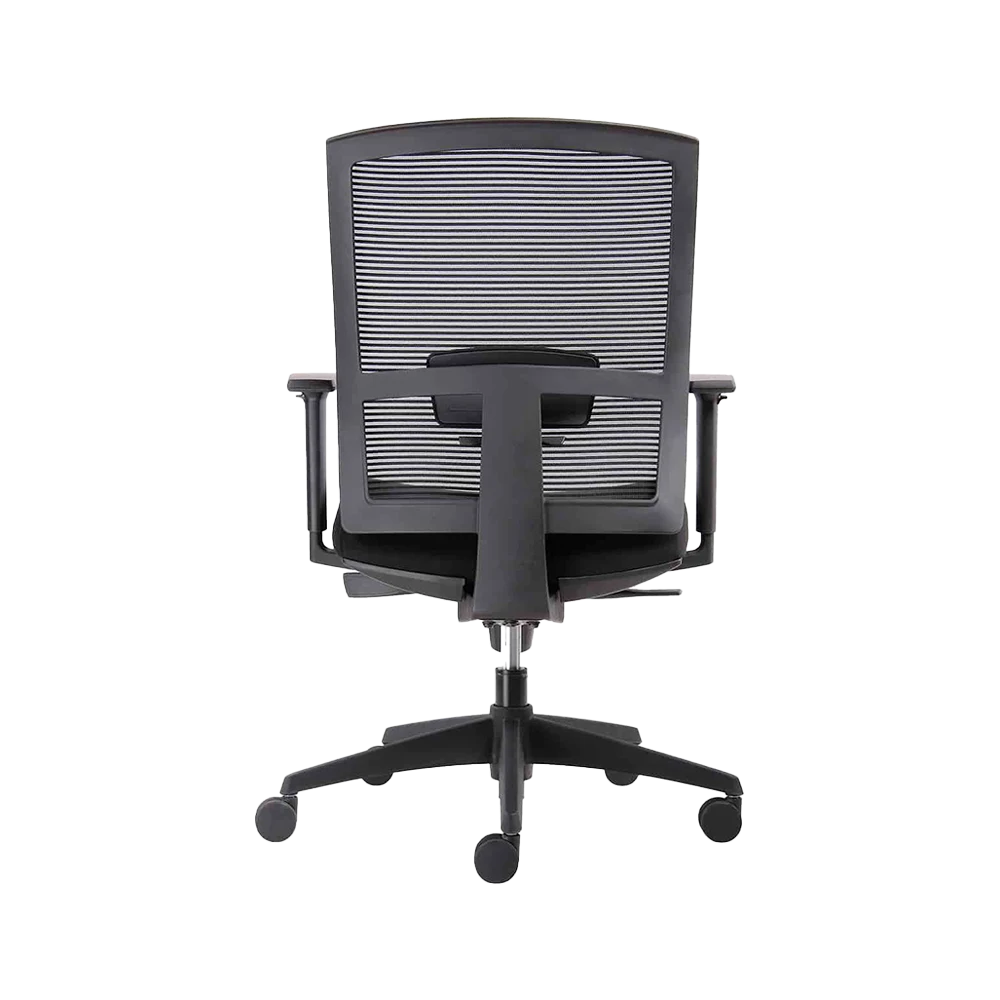 Equipada con respaldo medio en malla negra reclinable, incluye soporte lumbar fijo que favorece una postura alineada. El asiento tapizado en espuma moldeada ofrece comodidad estructurada para jornadas extensas. Sus brazos son regulables en altura y la base giratoria con ruedas asegura buena movilidad y ajuste de altura. Cuenta con cabecero opcional, ideal para quienes buscan soporte cervical adicional sin recargar el diseño.
