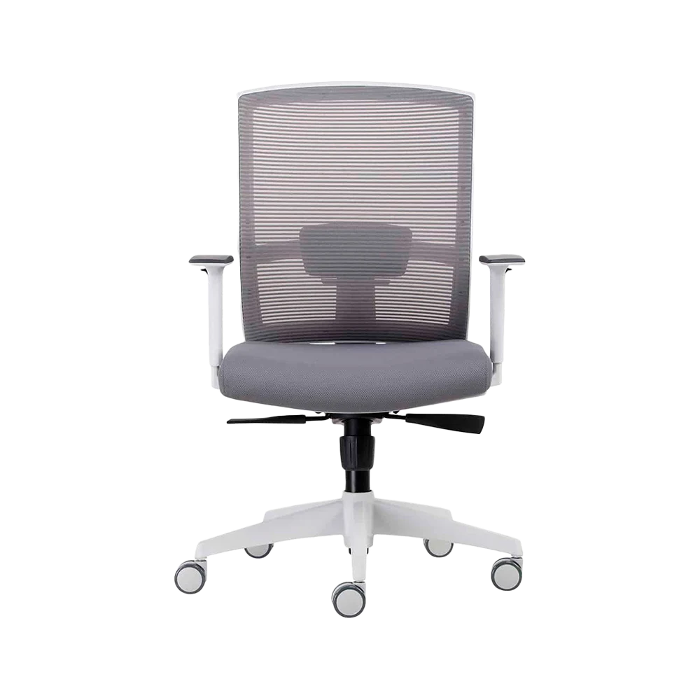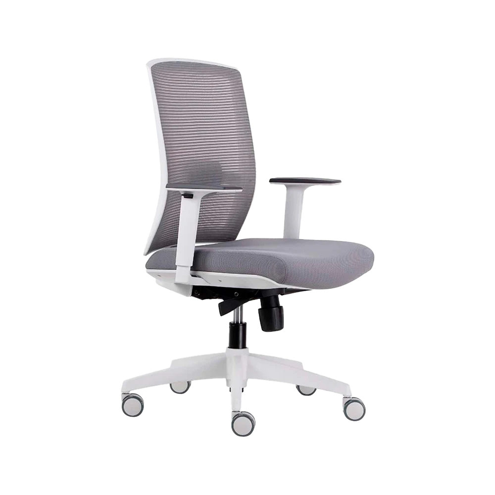 Equipada con respaldo en malla con soporte lumbar ajustable, asiento tapizado de alta densidad, mecanismo sincrónico y brazos regulables, permite personalizar completamente la postura del usuario. Su base de aluminio y ruedas silenciosas refuerzan la sensación de calidad y estabilidad.