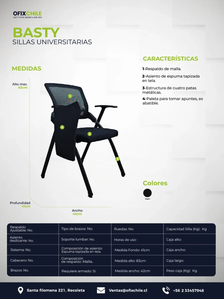 La Silla Universitaria Basty es una alternativa funcional y resistente para salas de clases, institutos, universidades y espacios de capacitación que requieren mobiliario práctico y duradero. Su diseño combina comodidad y estructura firme, ofreciendo una solución eficiente para jornadas académicas dinámicas.
