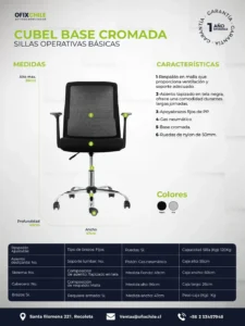Equipada con respaldo reclinable tapizado en malla, asiento acolchado en espuma de alta densidad y apoyabrazos fijos, garantiza un soporte firme y confortable para tareas diarias. Su base cromada aporta un toque visual más sofisticado, mientras que la estructura metálica asegura durabilidad en entornos de uso continuo.