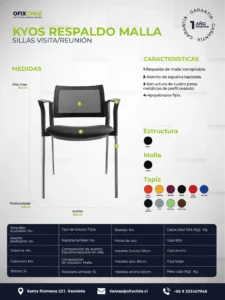 Kyos Respaldo Malla es una silla de visita diseñada para ofrecer soporte ergonómico básico, estética moderna y resistencia prolongada en ambientes corporativos o institucionales. Pensada para salas de reunión, zonas de espera o escritorios secundarios, combina estructura liviana con respaldo ventilado.