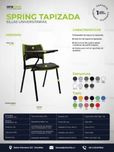 Spring Tapizada es una silla universitaria diseñada para ofrecer el máximo confort dentro de su categoría, combinando resistencia estructural con estética institucional. Pensada para auditorios, aulas o espacios de formación prolongada, combina estructura metálica con tapizado completo.