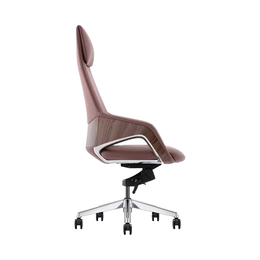 Equipa respaldo con curvatura lumbar integrada, tapizado en ecocuero, asiento de espuma de alta densidad, mecanismo basculante con regulación de tensión y base cromada con ruedas. Sus brazos fijos en acabado cromado aportan firmeza estructural y presencia visual destacada.