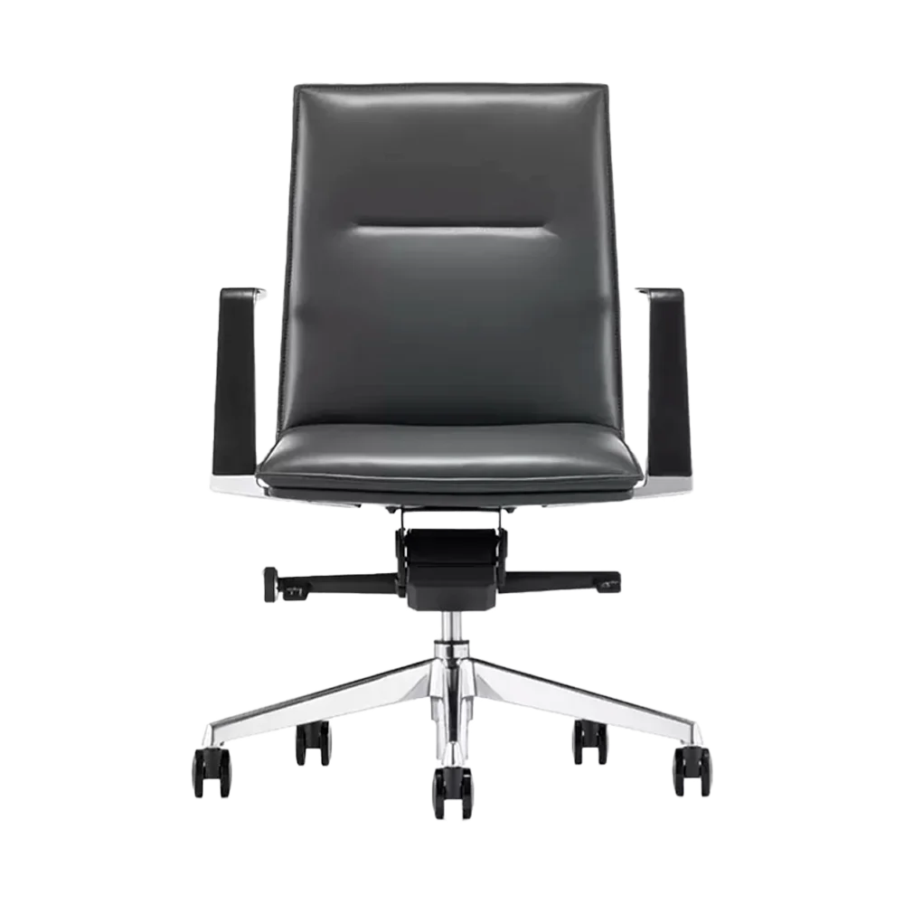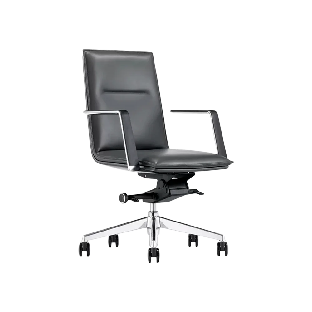 Equipa respaldo medio con curvatura lumbar integrada, tapizado en ecocuero, asiento acolchado, mecanismo basculante simple y base cromada con ruedas. Sus brazos fijos cromados completan una configuración sobria y funcional.