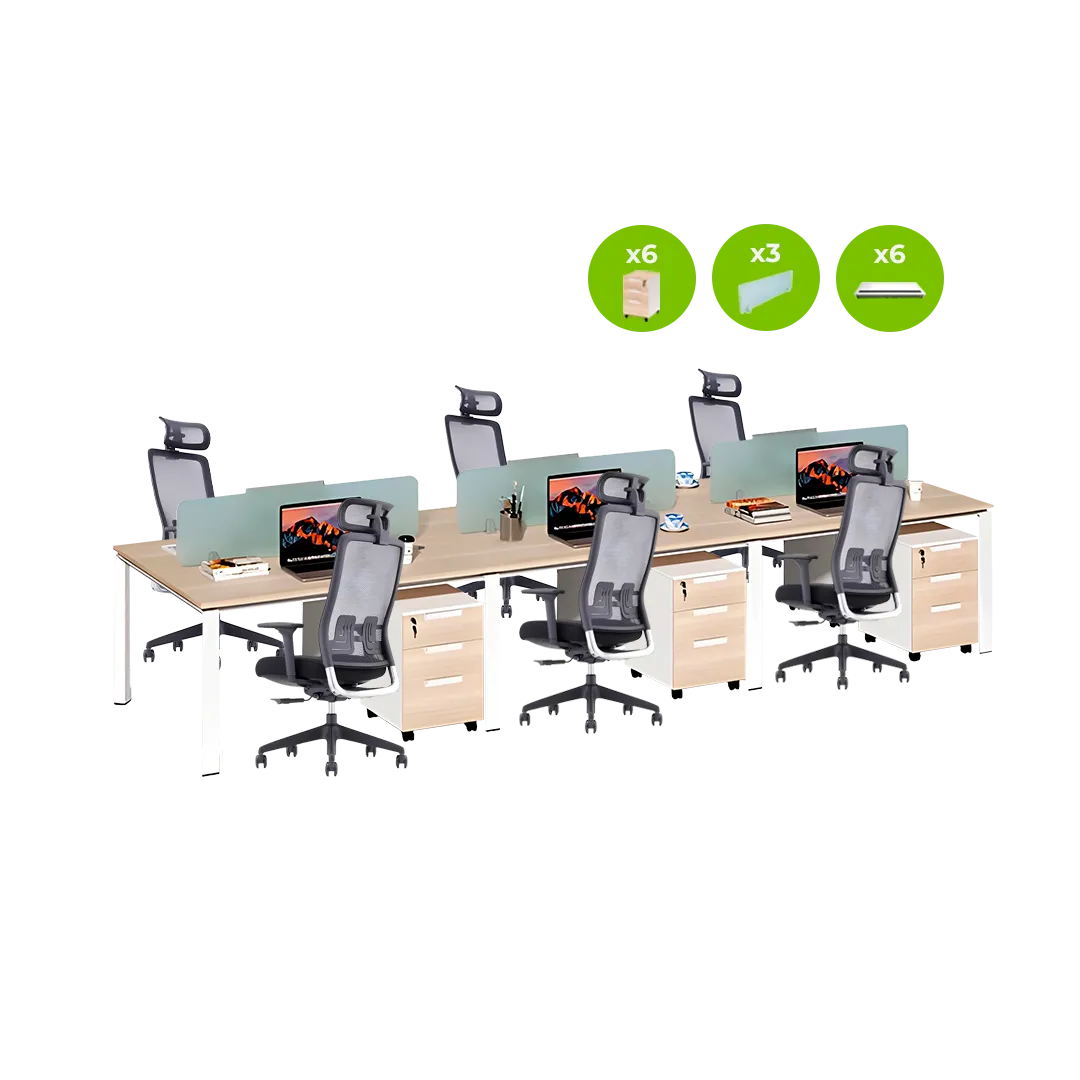Diseñada para equipos de seis personas, esta estación triple enfrentada combina funcionalidad, diseño corporativo y máxima resistencia. Cuenta con tres cubiertas dobles en melamina de 25 mm de espesor, con bordes de PVC de 2 mm, sostenidas por estructura metálica en acero electropintado con perfil triangular de 55×55×75 mm. Ideal para espacios colaborativos de alto tránsito.