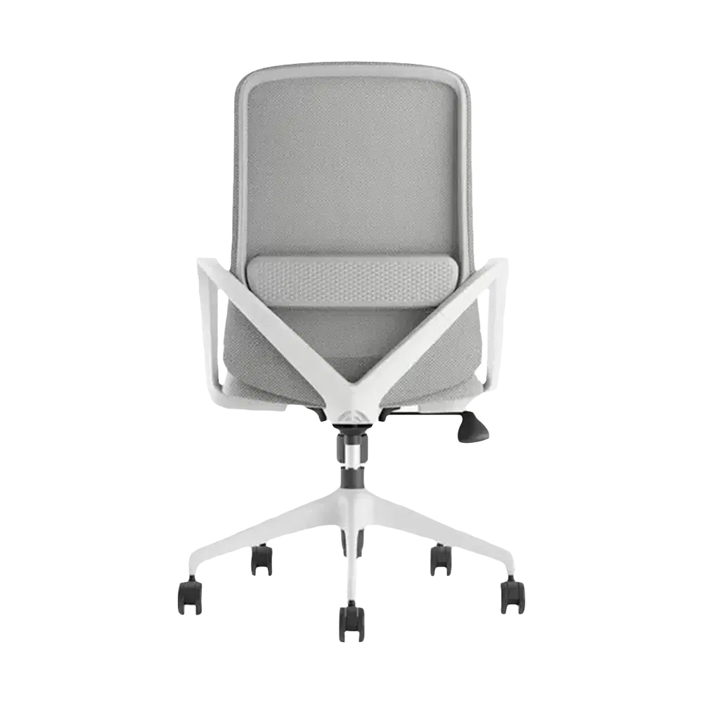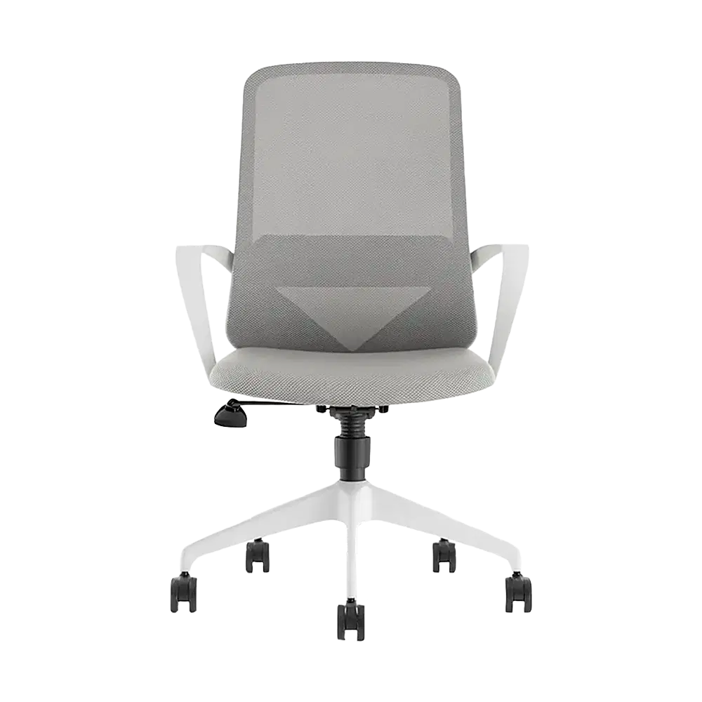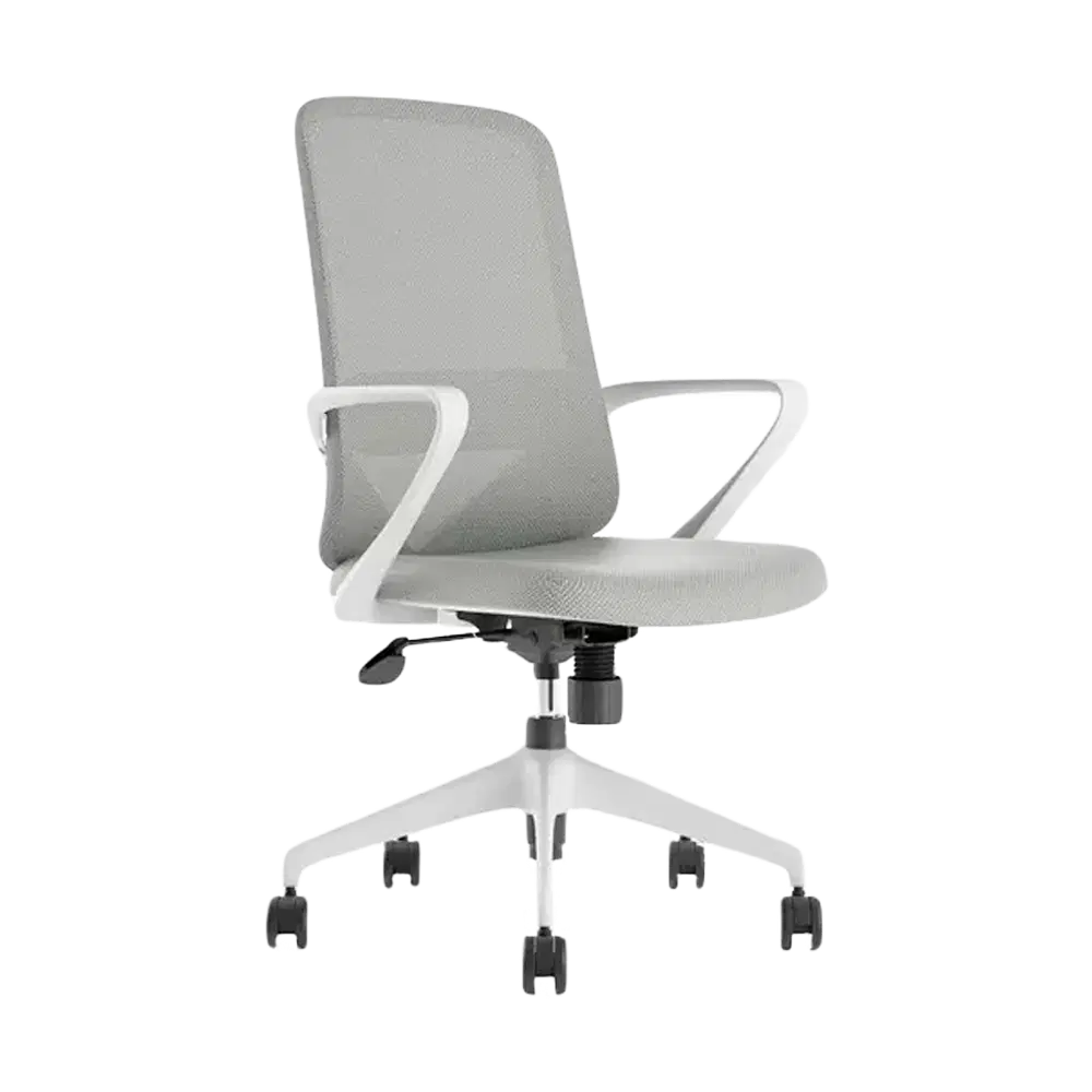 Incorpora respaldo reclinable en malla gris claro con soporte lumbar fijo y acolchado que brinda un apoyo ergonómico suave durante toda la jornada. Su asiento tapizado con espuma de alta densidad ofrece confort prolongado, mientras que los apoyabrazos fijos mantienen la postura del usuario estable. La base giratoria con ruedas y el mecanismo de ajuste de altura permiten adaptarse fácilmente a diferentes usuarios y tipos de estación.